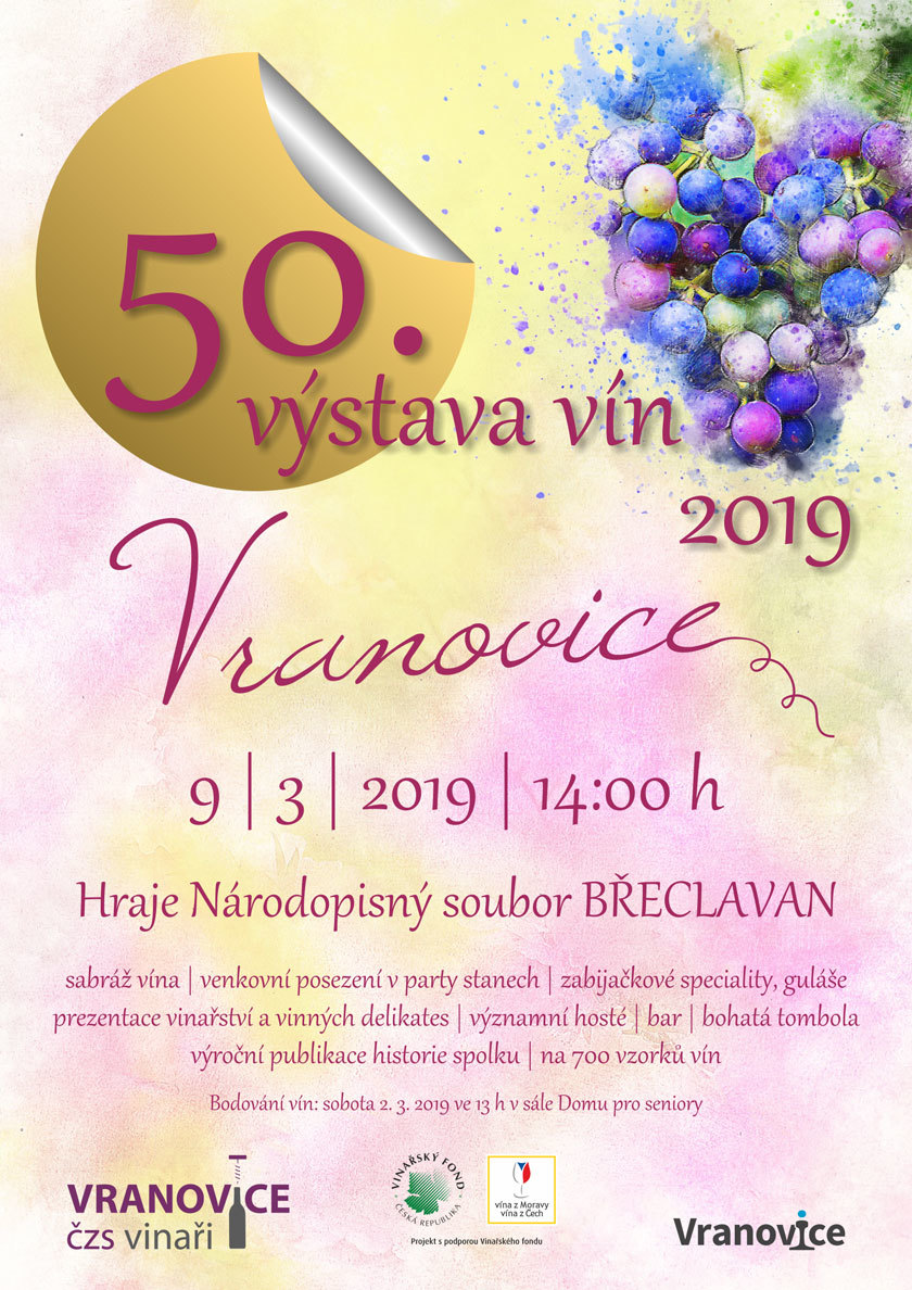 Vinaři Vranovice srdečně zvou na jubilejní 50. ročník výstavy vín. Uskuteční se v sobotu 9. března 2019 ve sportovní hale Sokolovny Vranovice. Výstavu zahájí sabráž vína, košt vín se rozšíří do venkovního prostoru, kde bude k dispozici gril se specialitami i prezentace vinařství z regionu. Na návštěvníky čeká na 700 vzorků vín, bar s občerstvením a exkluzivní tombola. Hraje národopisný soubor Břeclavan. Oficiální zahájení a předání cen je ve 14:00 h, degustace vín začíná ve 14:30 h.