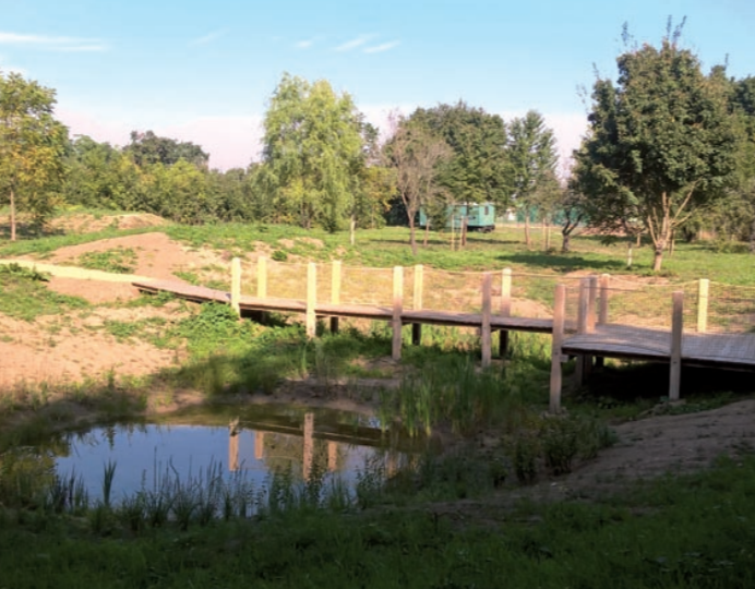 Nejvýraznějším prvkem dosud realizované části je mokřad s lávkou a pozorovacím molem, který je vytvořen v nejjižnější části školní zahrady. Mokřad byl vyhlouben až pod hladinu spodní vody, vytěžená zemina byla využita na terénní modelace zahrady skal a strání. Břehy mokřadu byly osázeny mokřadními rostlinami, v okolí byla založena květnatá louka a bylo vysazeno několik nových ovocných stromů.