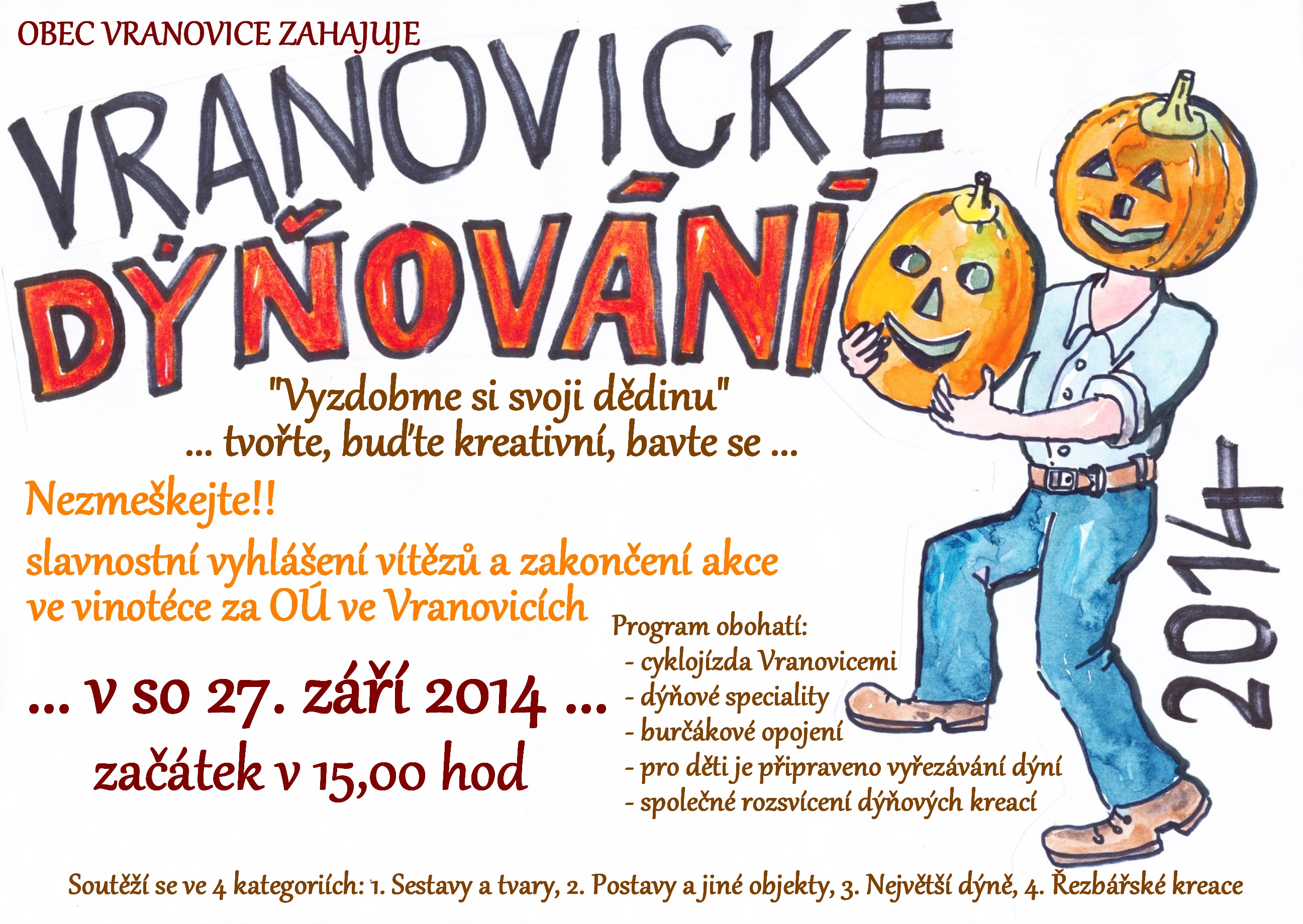 Centrum volného času Vranovice navazuje na úspěšný loňský ročník Vranovického dýňování a na letošní září opět vyhlašuje soutěž o nejlepší vyřezávané a vydlabávané dýně. Do soutěže se mohou zapojit všichni obyvatelé Vranovic tak, že před svůj dům, na zahradu či třeba do okna vystaví vyřezávanou dýni. Kulturní komise bude výtvory hodnotit do 25. září a v sobotu 27. září vyhlásí výsledky v místní vinotéce.