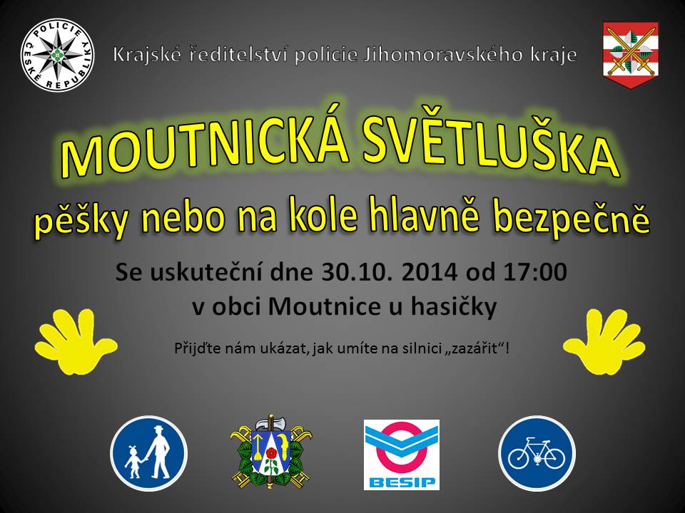 Krajské ředitelství policie Jihomoravského kraje ve spolupráci s obcí Moutnice zve na akci Moutnická světluška aneb pěšky nebo na kole hlavně bezpečně. Ve čtvrtek 30. října od 17:00 u moutnické hasičky policisté představí dětem povinnou výbavu kola, jak se chovat jako cyklista či chodec, jak se obléci, aby byly pro ostatní účastníky silničního provozu nepřehlédnutelné a jiné informace, které přispějí k bezpečnosti na silnici.