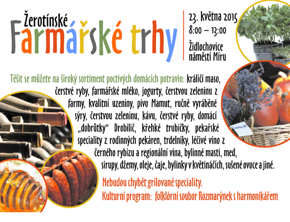 V sobotu 23. 5. v Židlochovicích pořádají druhý farmářský trh. Od 8 do 13 hodin tak budete moc na židlochovickém náměstí koupit spoustu regionálních potravin. O kulturní program se postará folklórní soubor Rozmarýnek z Pohořelic.